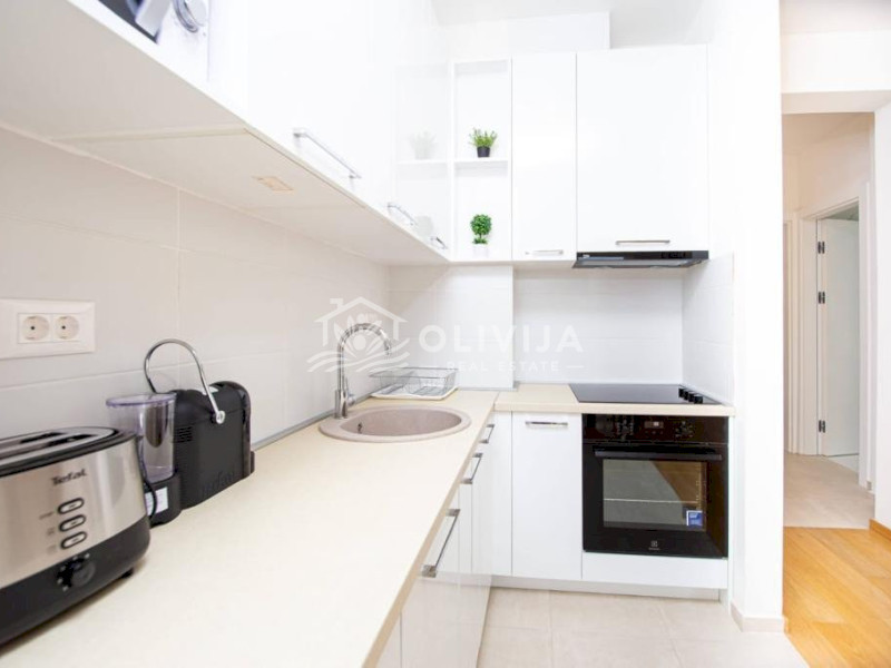 Stan sa 2 spavaće sobe, površine 85 m², nalazi se na 6. spratu, u novoj modernoj zgradi u Bečićima, na 5 minuta hoda od mora.