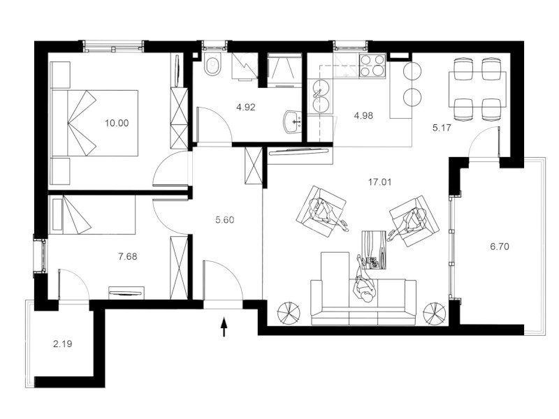 Struktura: 2 spavaće sobe, dnevni boravak, kuhinja, kupatilo, terasa.