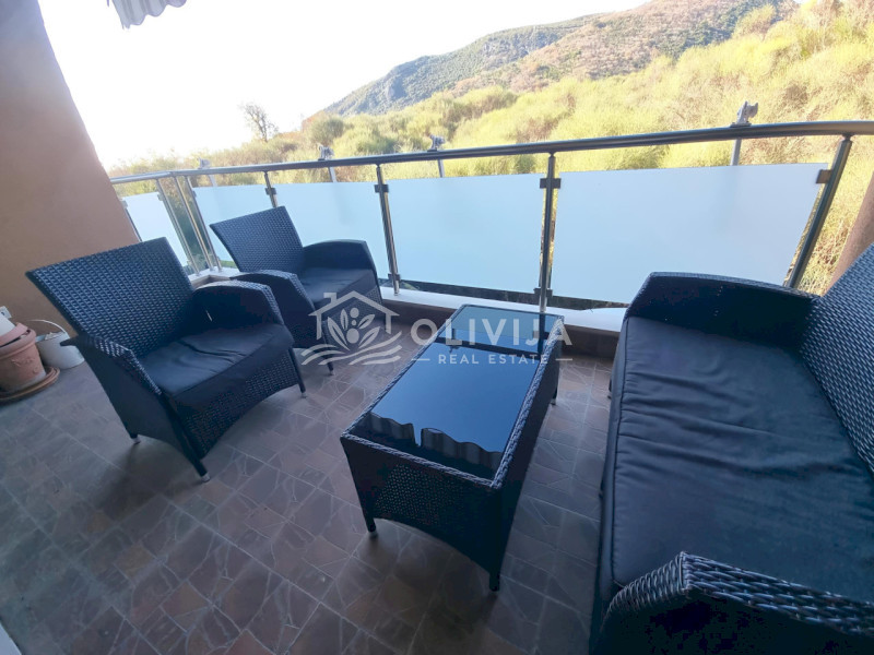В ней две спальни, просторная гостиная с кухонной зоной, ванная комната и терраса с видом на горы и море.