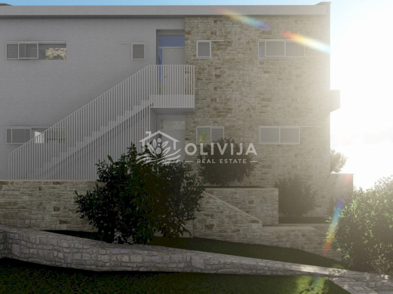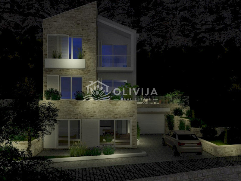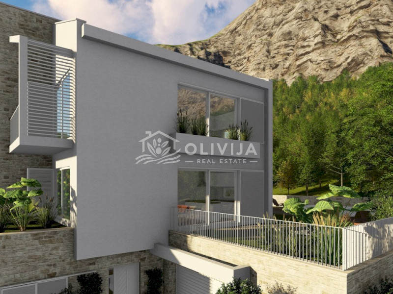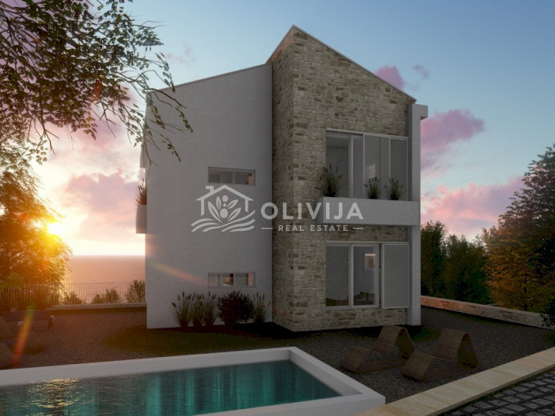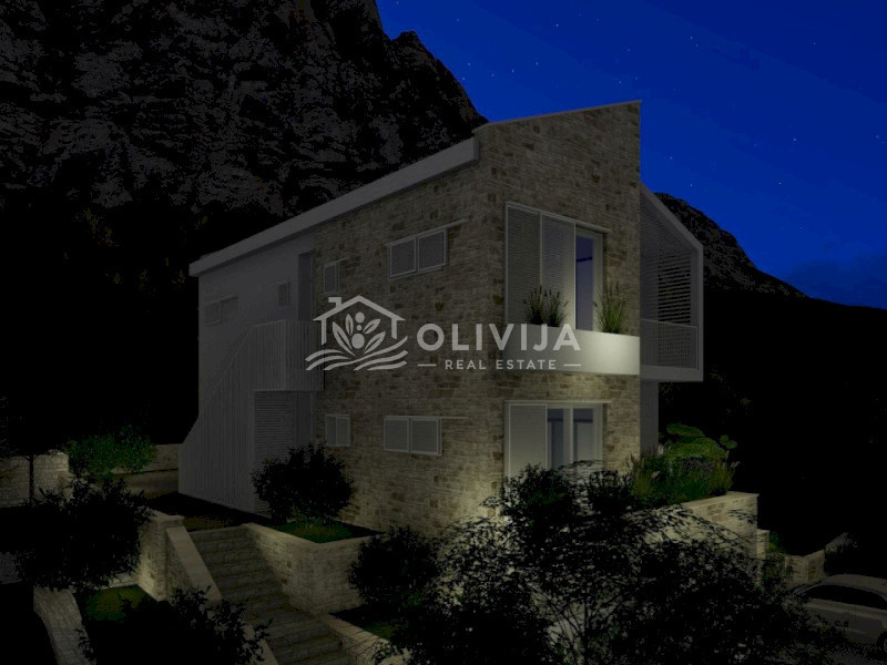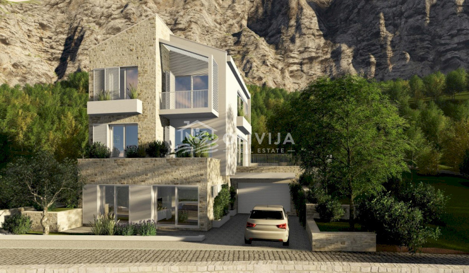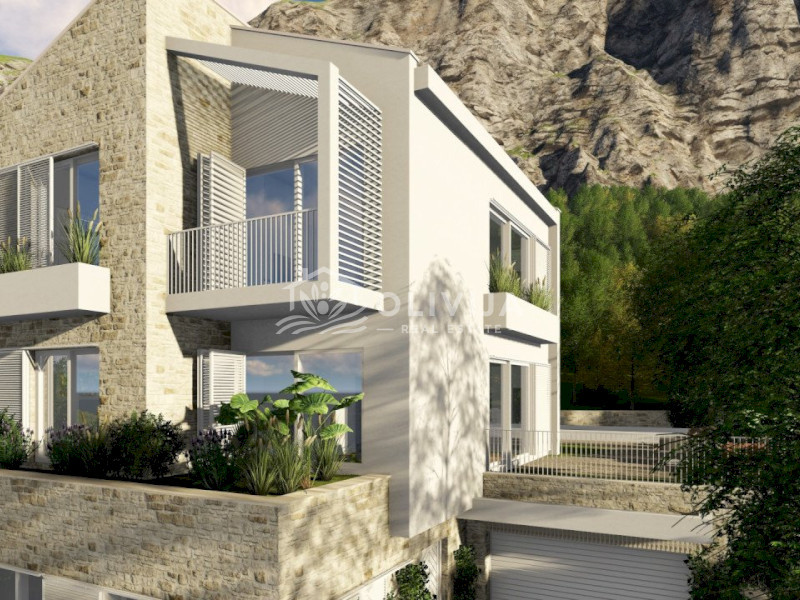 This exceptional villa is nestled on a picturesque hillside in Blizikuće, surrounded by mountains and lush greenery. The breathtaking panoramic sea views, which will remain unobstructed, make this project truly unique.