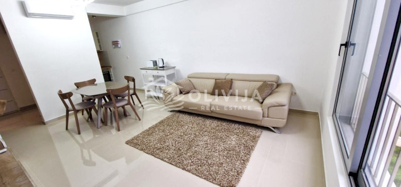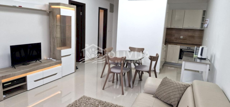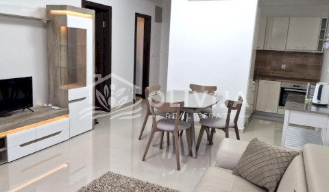 The apartment is furnished with modern furniture: bed, built-in kitchen, fold-out genuine leather sofa, display cabinet, wardrobe, table with 4 chairs.